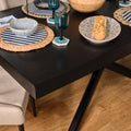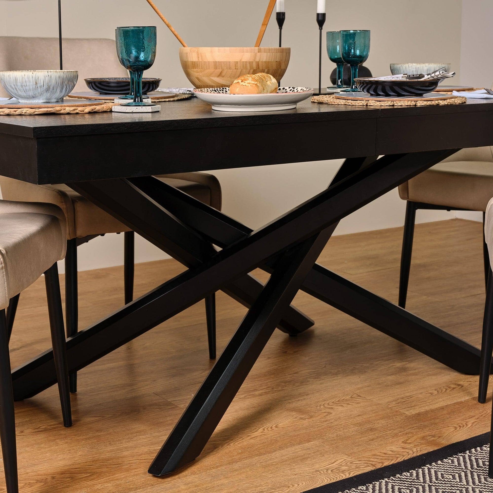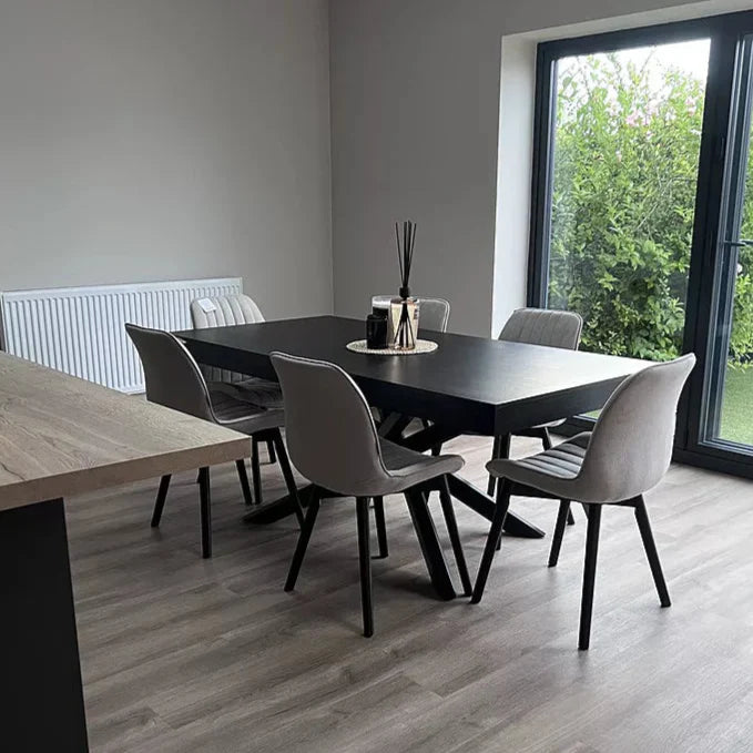 The Amelia and Bella 6-seater dining set showcases a sleek black rectangular table with a distinctive cross-legged design, accompanied by six Bella soft beige chairs upholstered in brushed weave polyester. This sophisticated black dining set is perfect for everyday meals and special gatherings with friends and family and is sure to make a lasting impression.