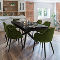 - Design Features - Amelia black dining table with crossover legs and 6 Freya armchairs in green velvet.