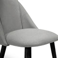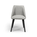 The Amelia oak dining table is designed with a black oak veneer tabletop and rubberwood cross over legs. This rectangular table comes with 6 Freya dining chairs each upholstered in a neutral fabric for softness and texture. The black chair legs complement the black table, and the Freya upholstered chairs complement the table beautifully.