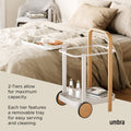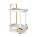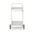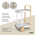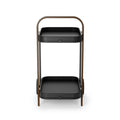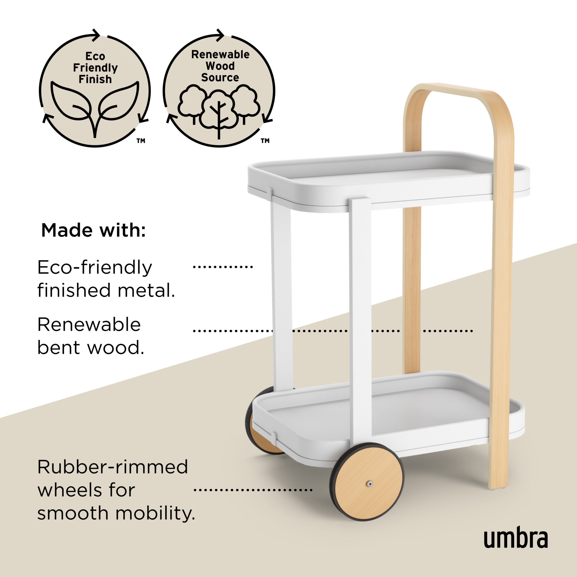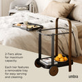 Upgrade your entertaining game with the stylish Bellwood Bar and Storage Cart. This modern, two-toned wooden cart is versatile and perfect for any corner of your home. Use it to create your own at-home bar setup, indoor garden cart, or side table. With rubber-rimmed wheels, you can easily move it around or remove a tray to serve on the go or clean. With two tiers, there's ample space for all your bar tools, stemware, decor, and more. Assembly is a breeze with included instructions and hardware. The classic design adds a subtle hint of charm and sophistication to any room while keeping your essentials organized in style! Elevate your home decor instantly with the Bellwood Bar and Storage Cart. Sourced from renewable wood sources and made with an eco-friendlier finish. It produces 85% less water and solid waste than traditional electroplating finishes. Measures 20.78 x 17.16 x 31.39" (53 x 44 x 80 cm). Weight capacity of 30 lbs. (13.6 kg) per tray. Wood is a unique natural material with variations in tone, texture, and grain. The product may vary from our imagery. For Best Care: Wipe with a clean damp cloth
