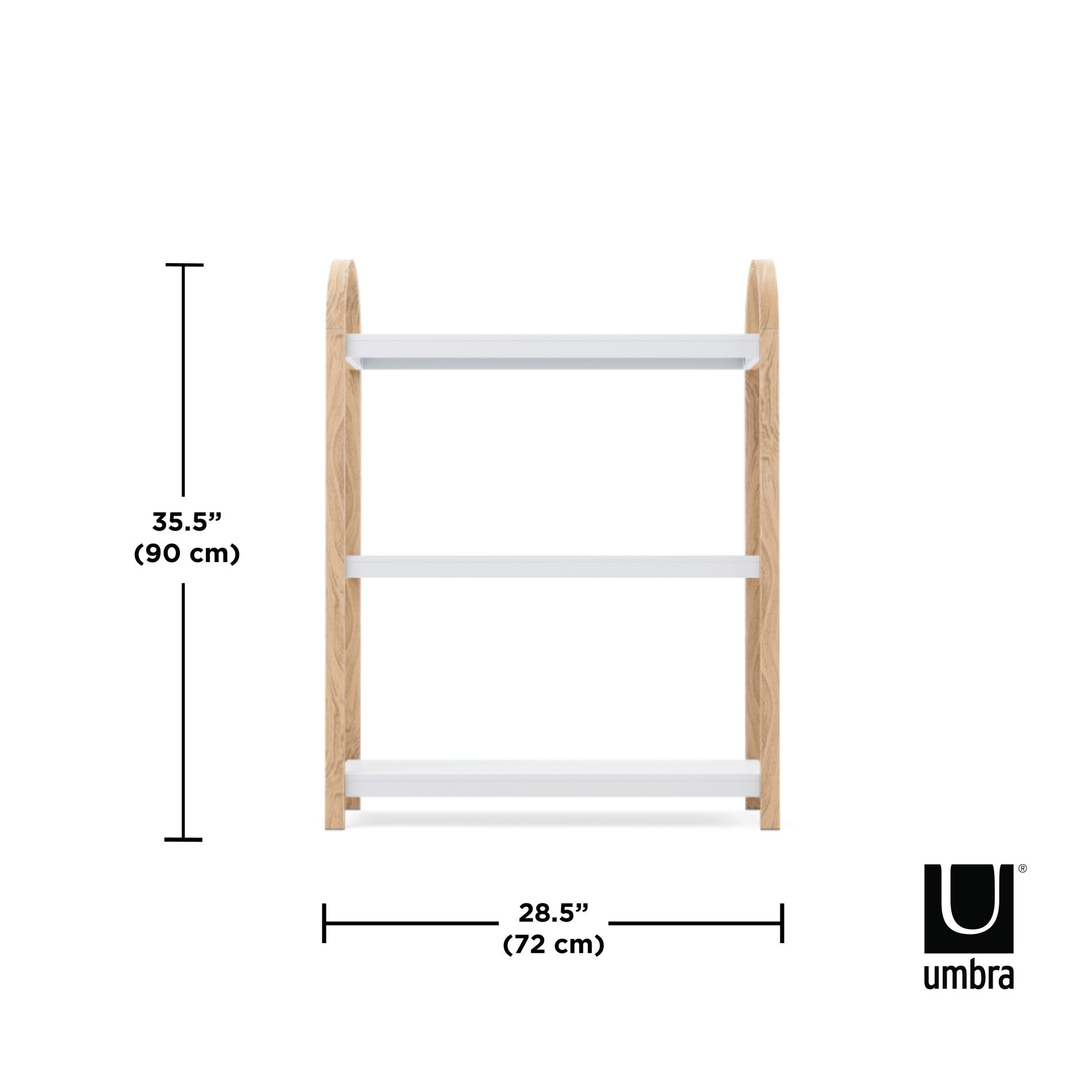 Both decorative and versatile, Bellwood Freestand Shelf can be used in a variety of rooms to showcase decor and/or store your items. Easy to assemble, Bellwood features real wood accents and integrated handles, making it easy to move around. Each shelf holds 29lbs (13 kg). Part of Umbra's Bellwood Family that includes a matching coffee table, side table, umbrella stand, over the toilet shelf, wall shelf and more. Includes a furniture safety strap that can be screwed into the wall. Sourced from renewable wood sources. Wood is a unique natural material with variations in tone, texture, and grain. The product may vary from our imagery. ⓘ For Best Care: use coasters to avoid direct contact to wood surfaces and if you experience a spill, wipe with a damp clean cloth immediately to avoid discoloration.