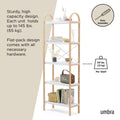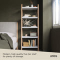 Both decorative and versatile, Bellwood Freestand Shelf can be used in a variety of rooms to showcase decor and/or store your items. Easy to assemble, Bellwood features real wood accents and integrated handles, making it easy to move around. Each shelf holds 29lbs (13 kg). Part of Umbra's Bellwood Family that includes a matching coffee table, side table, umbrella stand, over the toilet shelf, wall shelf and more. Includes a furniture safety strap that can be screwed into the wall. Measures 10.15 x 24 x 66.77 inches (26 x 61 x 170 cm). Sourced from renewable wood sources. Wood is a unique natural material with variations in tone, texture, and grain. The product may vary from our imagery. ⓘ For Best Care: use coasters to avoid direct contact to wood surfaces and if you experience a spill, wipe with a damp clean cloth immediately to avoid discoloration.