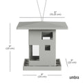 Invite wild birds to dine in style-and satisfy your taste for modern design-with this hip new spin on the traditional bird feeder. The Bird Cafe bird feeder from Umbra features a cube-shaped architectural form with asymmetrical windows. When filled, seed is visible through the clear plastic windows and flows out of holes in the bottom into the wrap-around tray for birds to perch on and feast. Bird Cafe's roof features an overhang design, allowing rain to clear off so that the bird feeder stays dry no matter the weather. Constructed of durable, molded plastic with a steel cable for hanging, feeder measures 9 x 9 x 8.46" (23 x 23 x 21 cm). Remove the lid to fill with seed from the top. Seed not included. Hand wash or wipe clean. Can hold approximately 68 oz (2 L.) of birdseed. Made with recycled plastics.