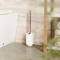 Umbra Adhesive Toilet Brush makes cleaning your toilet a less gruesome chore. With rubberized bristles that are both soft and durable, this toilet brush prevents odor-causing bacteria, mold, or mildew for a sanitary and long-lasting brush. Its lid stays open when the brush is removed and automatically closes when put back in place, all without having to touch anything but the handle. Flex Toilet Brush’s canister neatly stores the brush when not in use and can be secured to the floor or to any smooth surface. Easy to install, Flex Adhesive Toilet Brush includes non-damaging, waterproof adhesive strips that can be applied on various surfaces such as tiles, drywall, concrete, etc. (does not work on porous surfaces). Measures 4.5 x 3.25 x 17" (11 x 8 x 43cm). Part of Umbra's Flex Adhesive Bath Collection. ♻️ Made from 50% recycled plastic. ⓘ Non-Damaging Adhesive Installation: Completely non-damaging to your tiled walls. Includes a strong adhesive backing that can be applied on various surfaces such as tiles, drywall, concrete, etc. Surfaces must be smooth and clean for mounting. Warning: Surface damage may occur if adhesive mounting is removed from drywall, concrete, wallpaper, and porous surfaces.