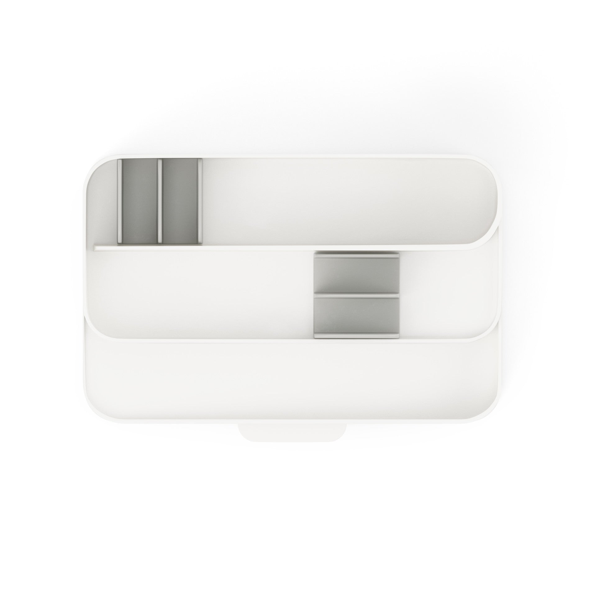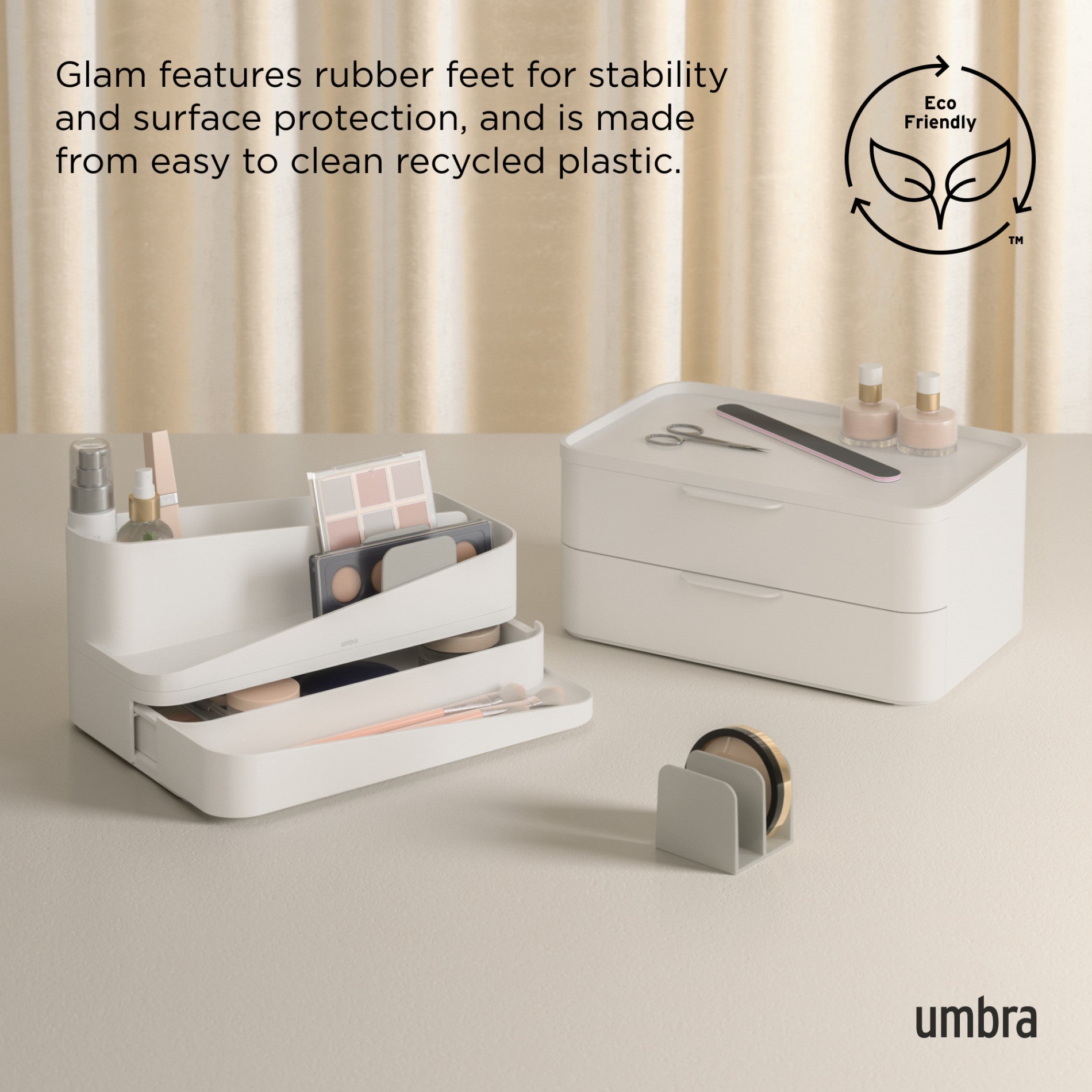 Create the ultimate beauty station setup with Glam Large Organizer. Inspired by our original Glam Hair Tool & Cosmetic Organizers, this new addition features three drawers for maximum organization, and can be used for everything from makeup and skincare to office accessories. The modular organization system means you can stack it or use it separately, and the customizable/removable dividers give you extra flexibility for items like palettes, brushes and more. The rubber feet keep the organizer in place, while preventing damage to your tables or countertops. Glam also makes the perfect gift for any friend or family member - keeping makeup and skincare products all in one convenient and organized place. Made with recycled plastic. Measures 10.50 x 7.25 x 9.75" (26.7 x 18 x 25 cm). ⓘ Plastic material can react to chemicals such as alcohol, acetone, benzene, toluene and cause cracks and discoloration. Clean with water only