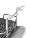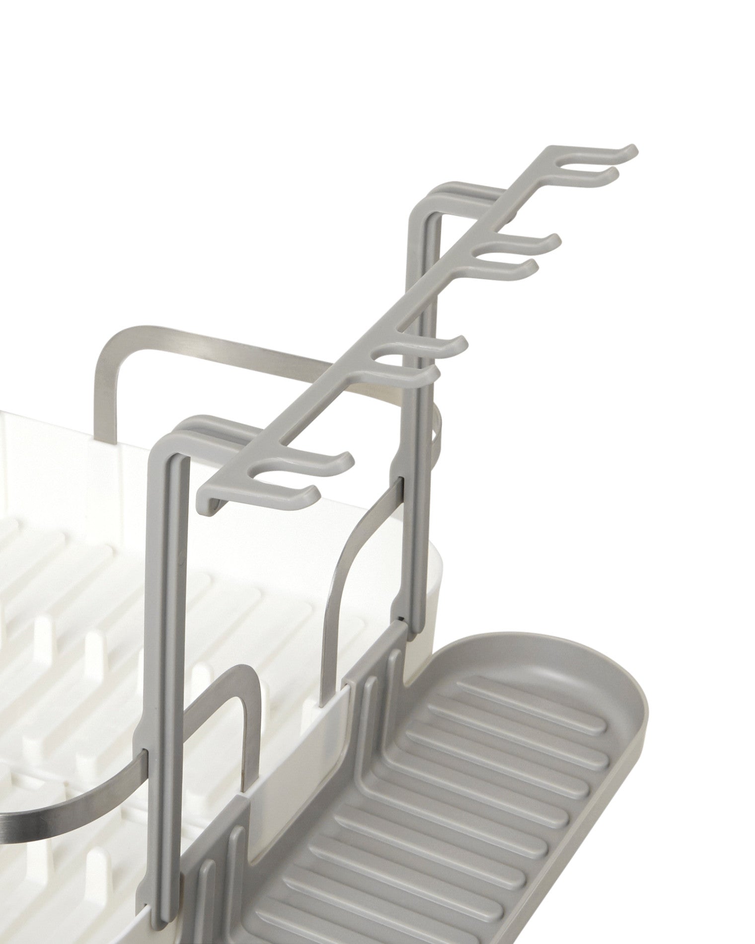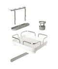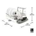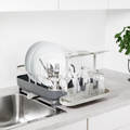 This dish rack is made of molded plastic and has a stainless-steel frame making it both durable and easy to clean. Holster has a 15-plate capacity, utensil storage, moveable stemware holder, a multi-purpose side tray and dual position drain spot. With soft, curved lines, this low profile, molded plastic caddy is a modern but approachable piece for everyday kitchen use. Measures 16.57 x 13.54 x 5.87" (42 x 34 x 15 cm). Made with recycled plastics.