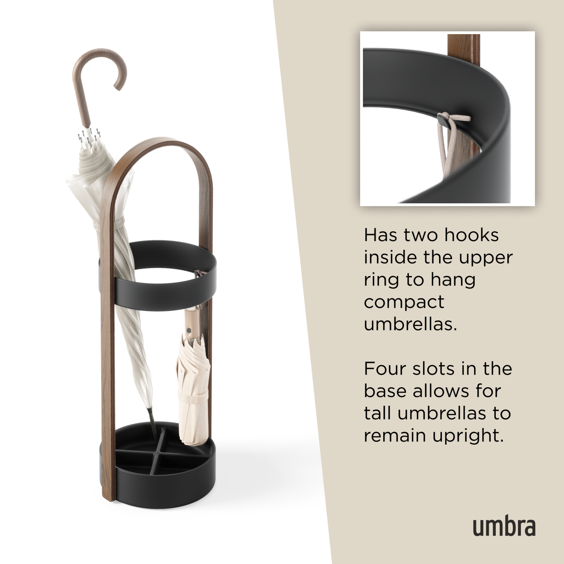 The Bellwood Umbrella Stand is durable as it is stylish thanks to its beautiful and shape and resin base, which is water-resistant and prevents rusting. Featuring a round base and a curved wood veneer handle with an upper ring made of steel. This piece is easy to assemble and includes all hardware. Its slots will hold your tall umbrellas with ease and its tiny hooks on the top of the ring will hold your more compact, short umbrellas. Measuring 8.63 x 9.63 x 26.88 inches (22 x 24 x 68 cm) this stylish piece will fit neatly into many different spaces and styles of décor. Sourced from renewable wood sources. Wood is a unique natural material with variations in tone, texture, and grain. The product may vary from our imagery. ⓘ For Best Care: wipe with a clean damp cloth