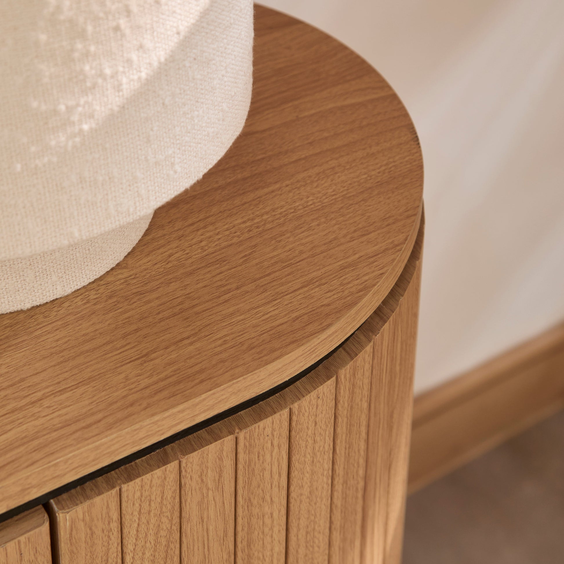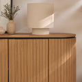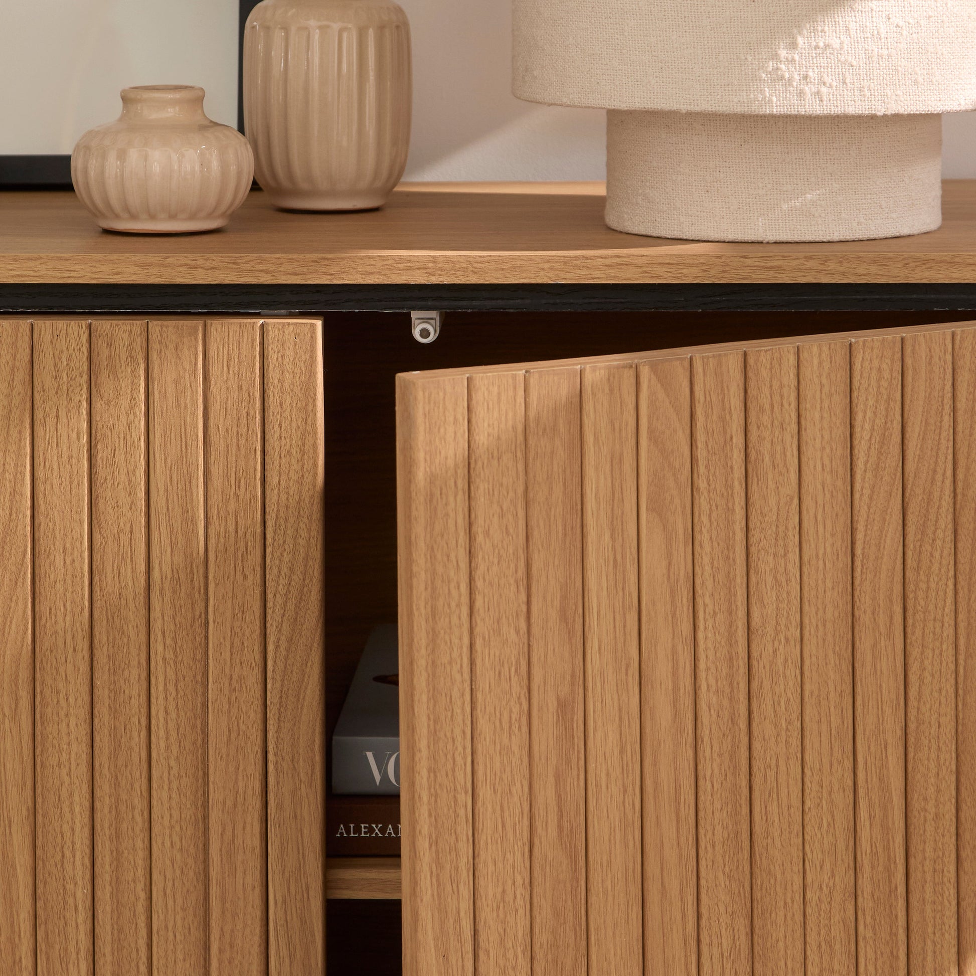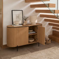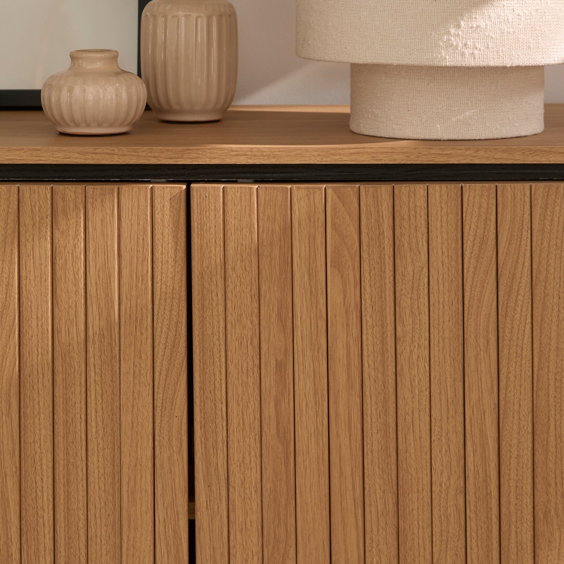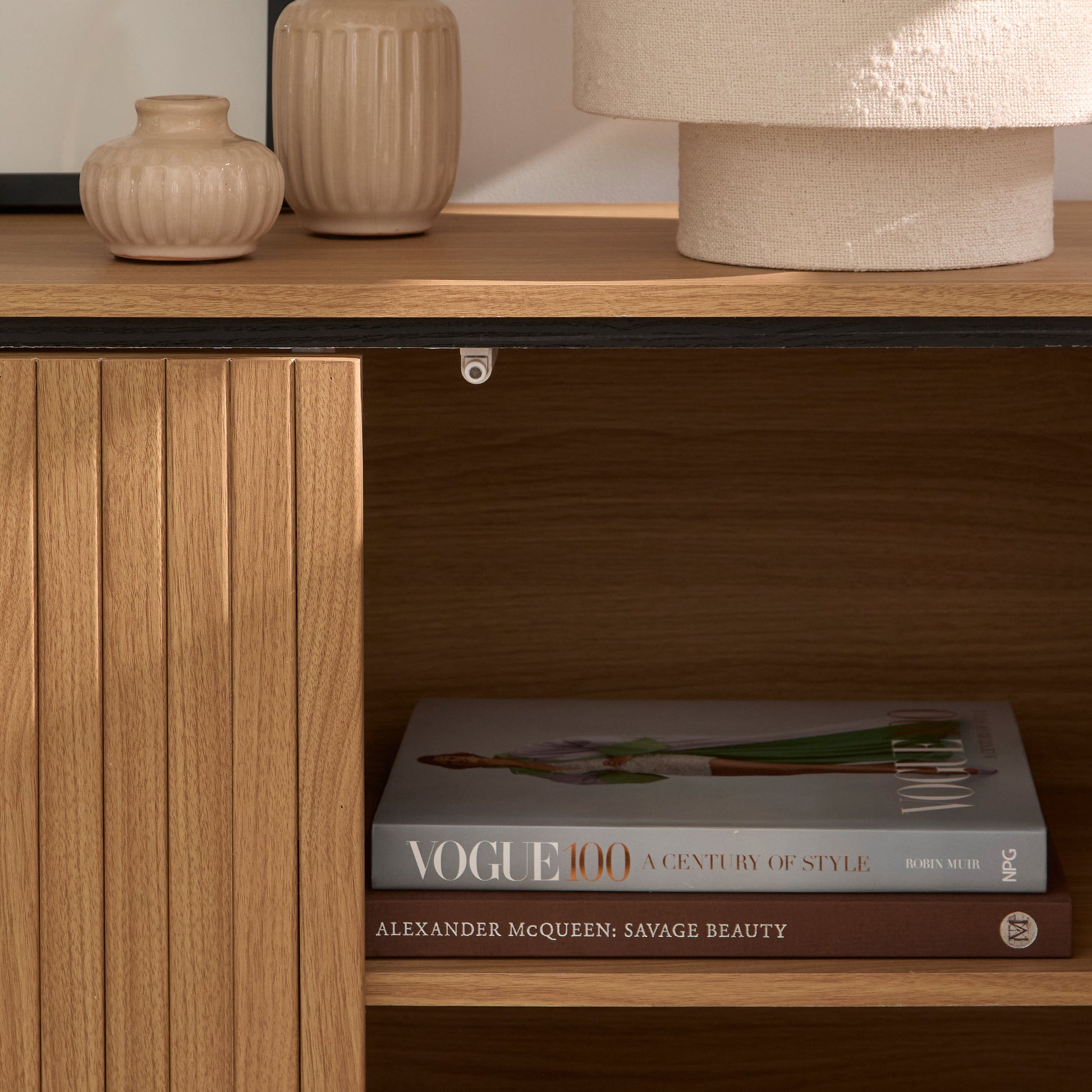 Elevate your home with elegant and practical storage furniture like the chic Matius 3 door sideboard. With a stylish oak effect finish, Matius features curved edges, slatted handleless doors and stands on black legs giving a sophisticated finish. Inside there's a shelf for storage.