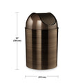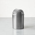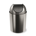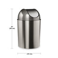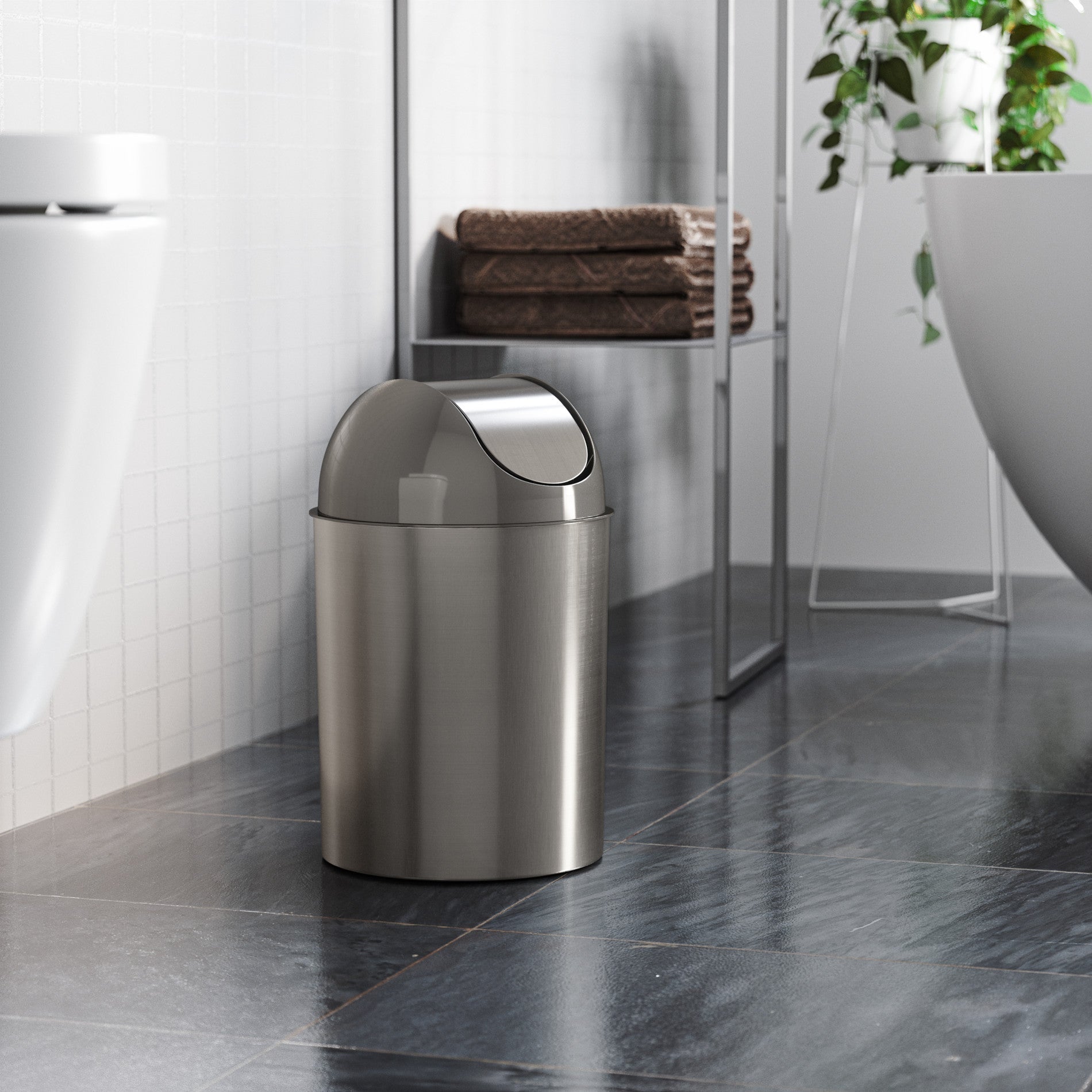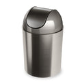Mezzo Trash Can is a sleek trash can, giving the appearance of brushed metal, without the weight or maintenance. Its material ensures Mezzo is durable and long-lasting. The swing-top lid helps conceal garbage contents and odor. Mezzo is rust proof, dent proof, waterproof and easy-to-clean, and holds up to 2.5 gallons (9L). The can is miniature and geared towards small spaces, measuring at 15" (38 cm) tall with a 9" (23 cm) diameter.