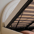 Introduce some curve appeal to your bedroom with a beautiful Mimi double ottoman bed featuring a stylish arched shaped headboard finished in soft white boucle fabric. The fluted effect finish of the headboard brings texture and warmth to any bedroom. Plus, this double bed design boasts an ottoman storage feature ideal for storing bedding, blankets or seasonal clothing. The base lifts up and is held by a safety mechanism for storage access.