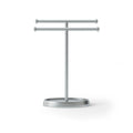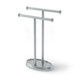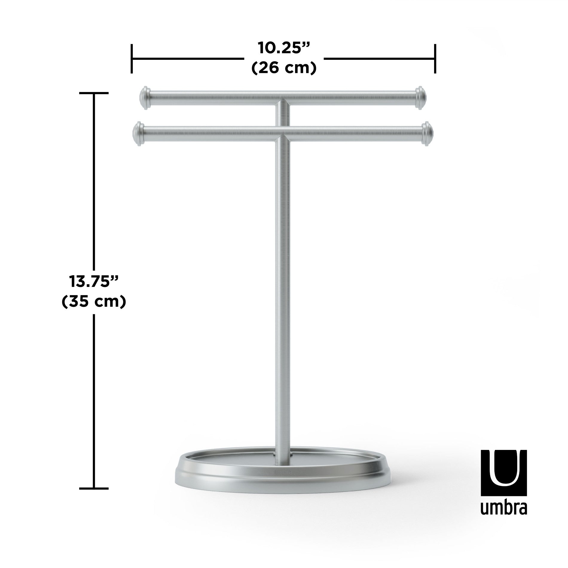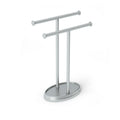 Palm Double Towel Tree keeps towels clean and orderly, and your countertop organized. The elegant towel stand is designed using strong metal, and a sleek nickel-finish. Its compact dimensions of 10.25 x 4.75 x 13.75 inches (26 x 12 x 35 cm) allow it to be easily stored on any surface. Fulfilling its intended purpose of holding 2 hand towels, Palm's base can also be used as a tray for miscellaneous items. This towel tree is made with an eco-friendlier finish. It produces 85% less water and solid waste than traditional electroplating finishes.