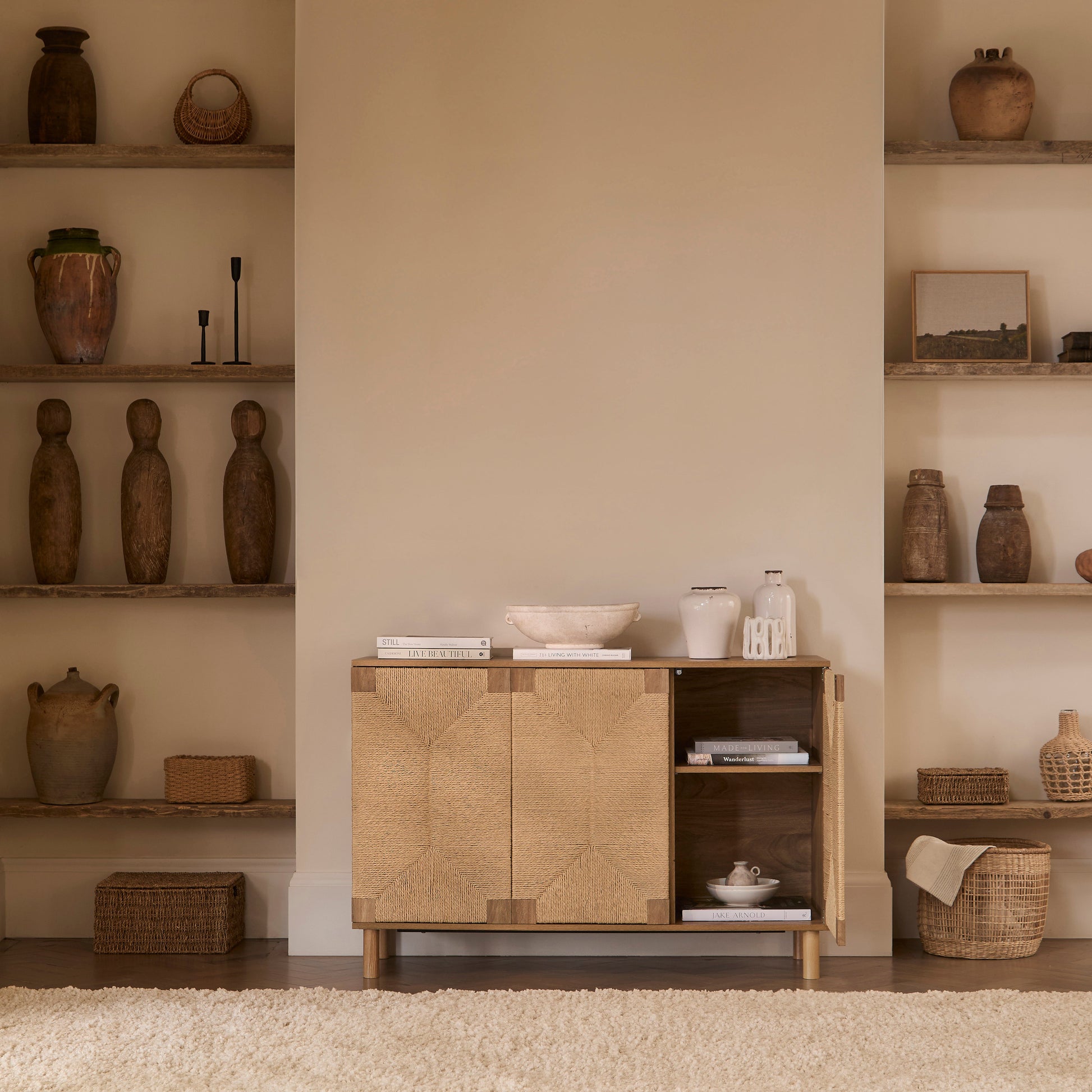 The Paloma natural weave sideboard stands on raised natural oak legs and features a 3 door front each with a natural woven string finish and push to open door function. Inside the Paloma sideboard is a shelf offering plenty of storage inside. Paloma with elevate your home bringing texture and natural tones to your space offering interest and timeless appeal.