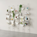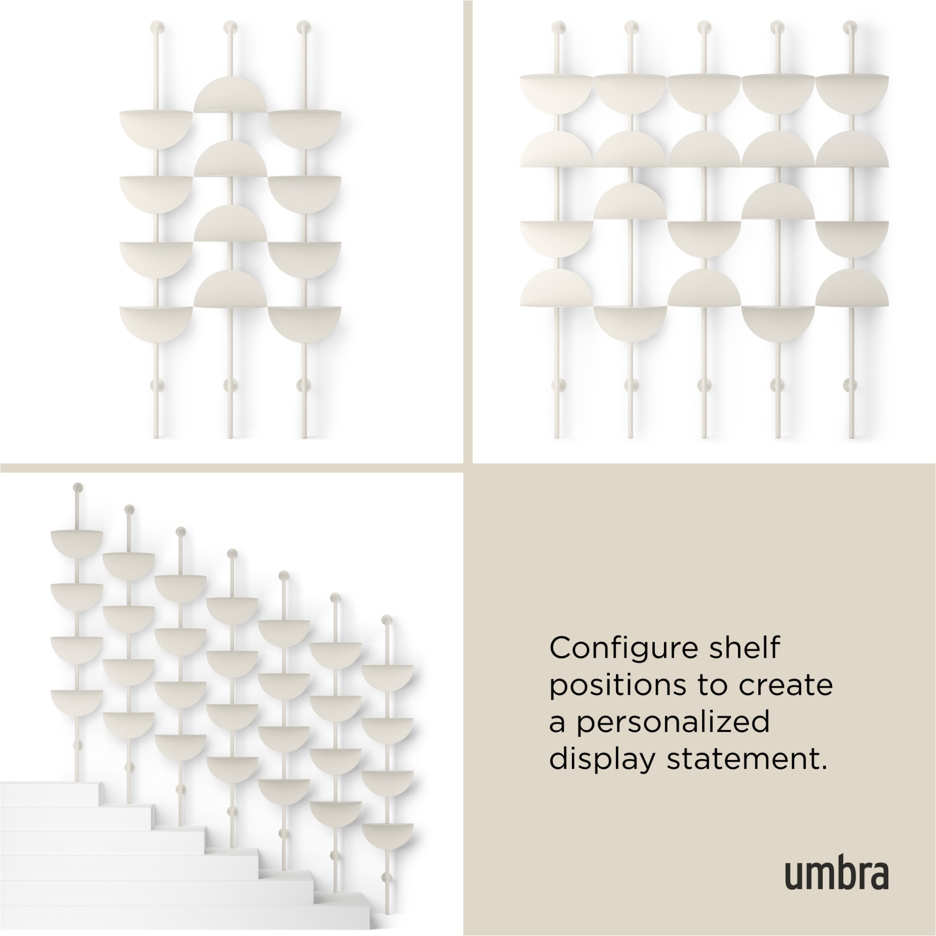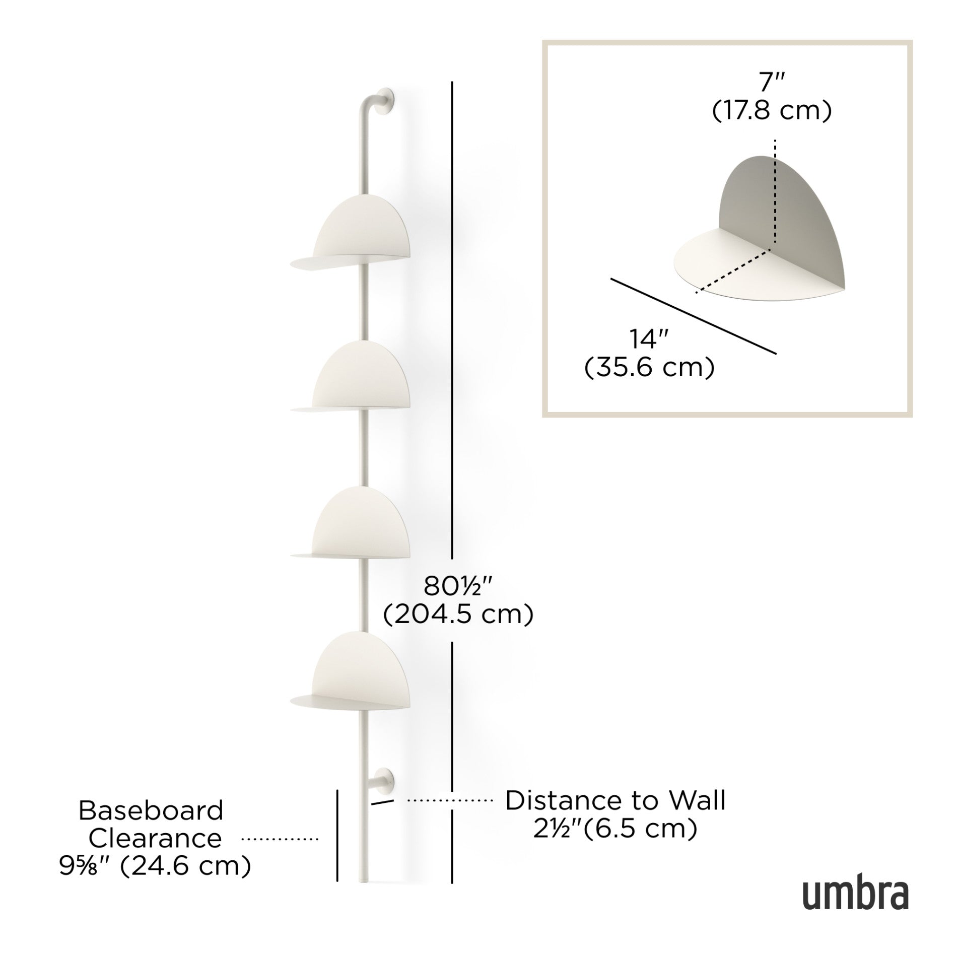 Introducing the Solis Shelf: an eye-catching and versatile solution to elevate your display game. Crafted with precision, this set features four half-circle steel shelves elegantly mounted on a pole that effortlessly integrates with your space. The innovative design offers flexibility, allowing you to choose between two mounting options for each shelf: half-moon facing up or down. Plus, customize the spacing between shelves to perfectly showcase your favorite items, whether at home, in retail displays, or at trade shows. Constructed from durable bent steel, each shelf supports up to 15lbs. (6.8kg) of your prized possessions. Use multiple shelves to create your own customized eye-catching statement. Measures 13.88 x 10.5 x 80.13" (35 x 27 x 204 cm).