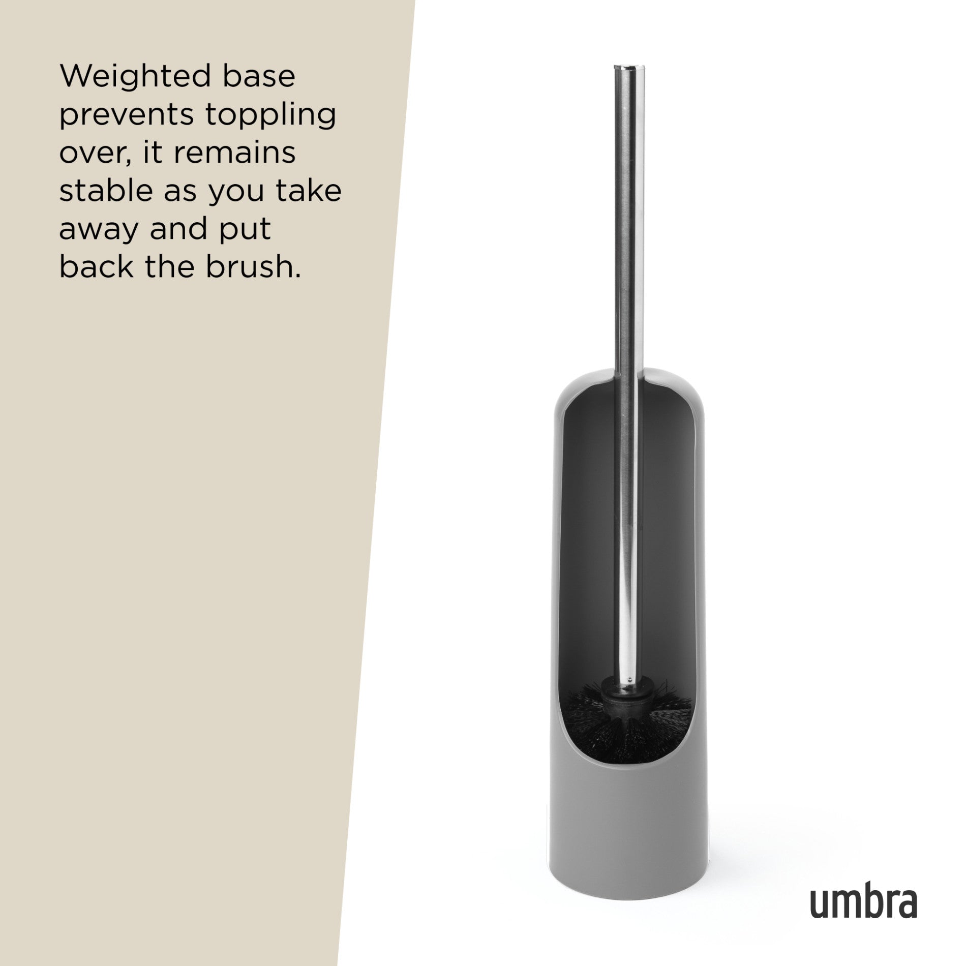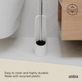 Thanks to its compact size, 3.54 x 3.54 x 17.2" (9 x 9 x 44 cm) and clean, curved, lines that are pleasing to the eye, yet unobtrusive, the Touch Toilet Brush Holder remains discreet while tucked away beside your toilet. Touch is made of a matte, soft-touch molded material, which is easy to clean, and highly durable. The finish is delicate and smooth to the touch, plus it looks good. Included with the holder is a sleek brush featuring a chrome handle. Touch has a weighted base meaning it won’t topple over, remaining stable as you take away and put back the brush. Match this toilet brush with other products from the Touch Bath Collection for a cohesive look. Made with recycled plastics.