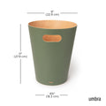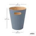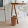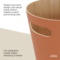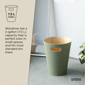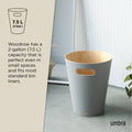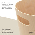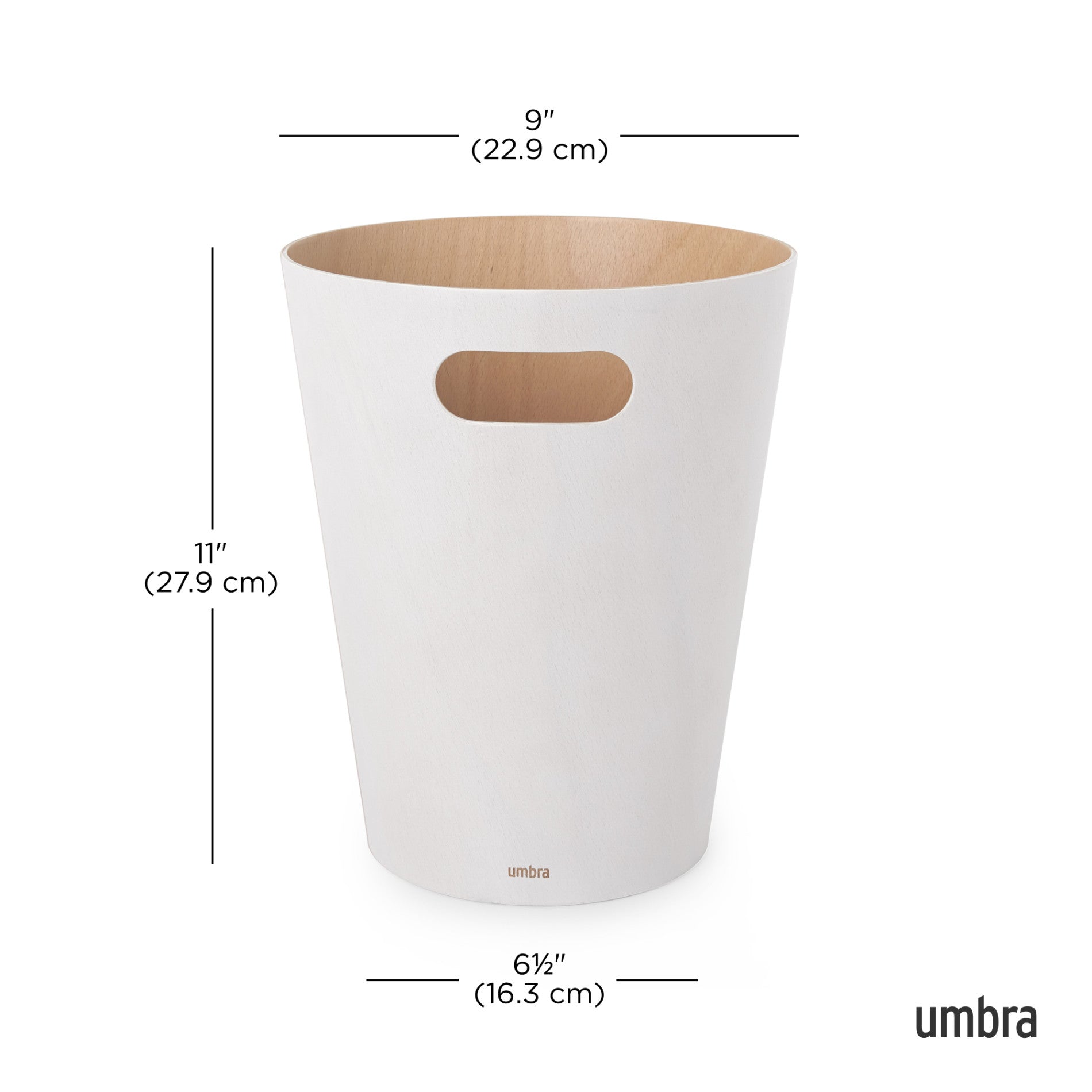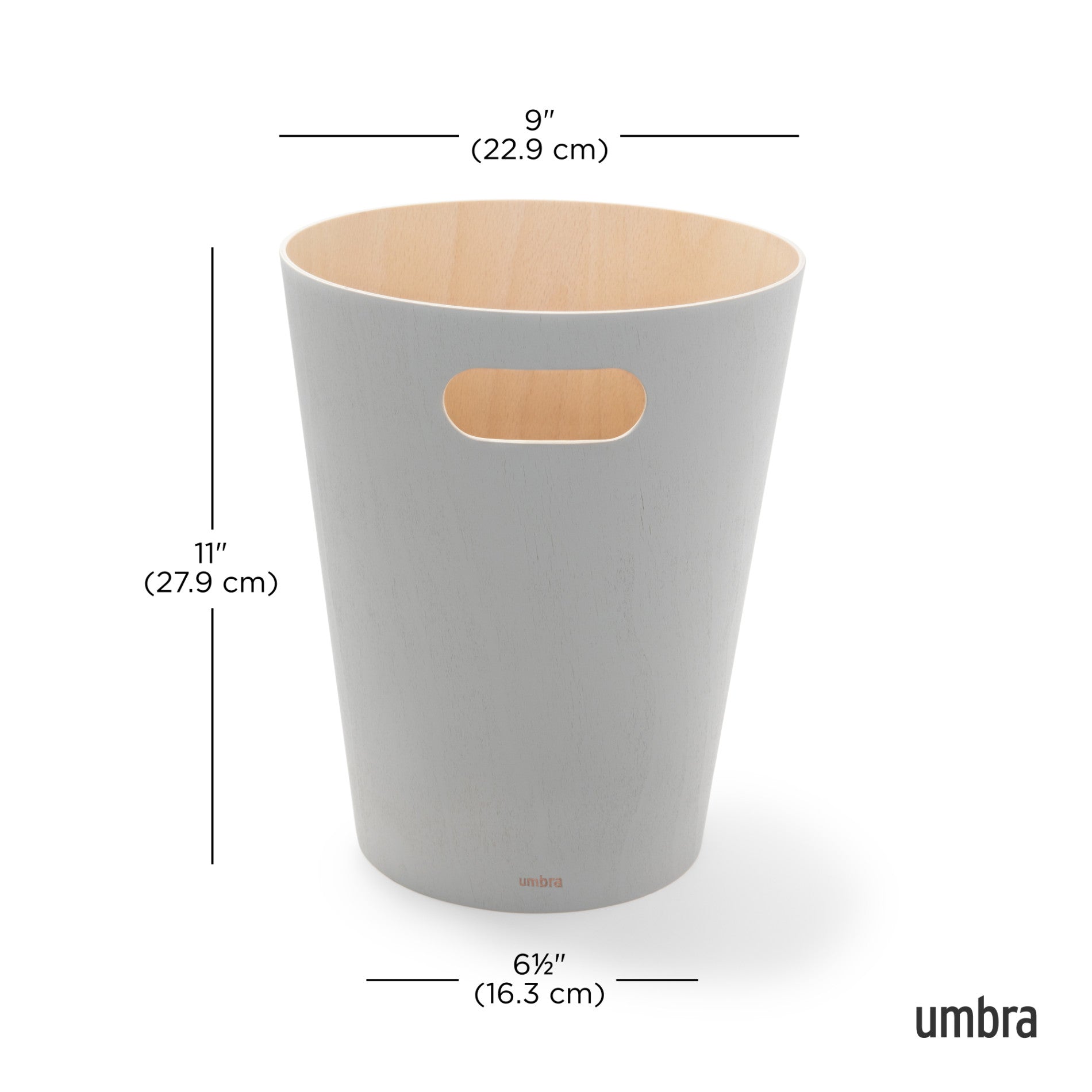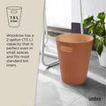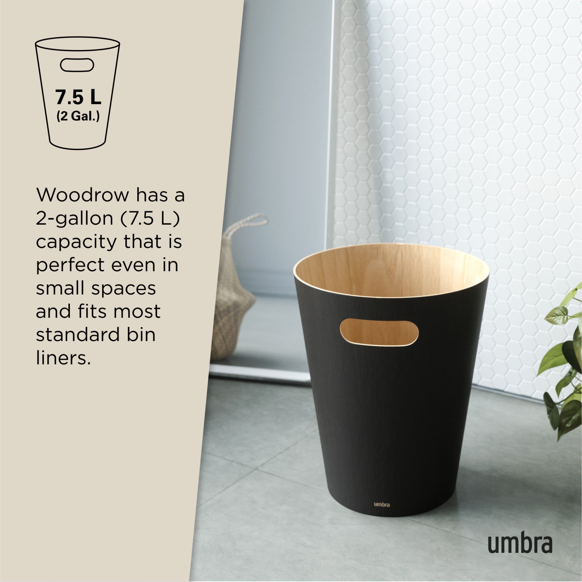 Upgrade your space with Woodrow, a modern waste can that adds both style and function to any room. Its sleek two-tone design, featuring a natural wood interior and a stained exterior, creates a warm and inviting atmosphere. With its integrated handles, Woodrow is easy to move, making disposal quick and effortless. The unique curved shape turns this everyday essential into a decor piece that stands out. Perfect for compact spaces like powder rooms, offices, or studies, Woodrow offers a 2-gallon (7.5L) capacity in a compact design. For best care, use a bag liner or avoid putting wet items directly against the wood surface.