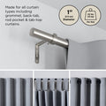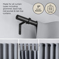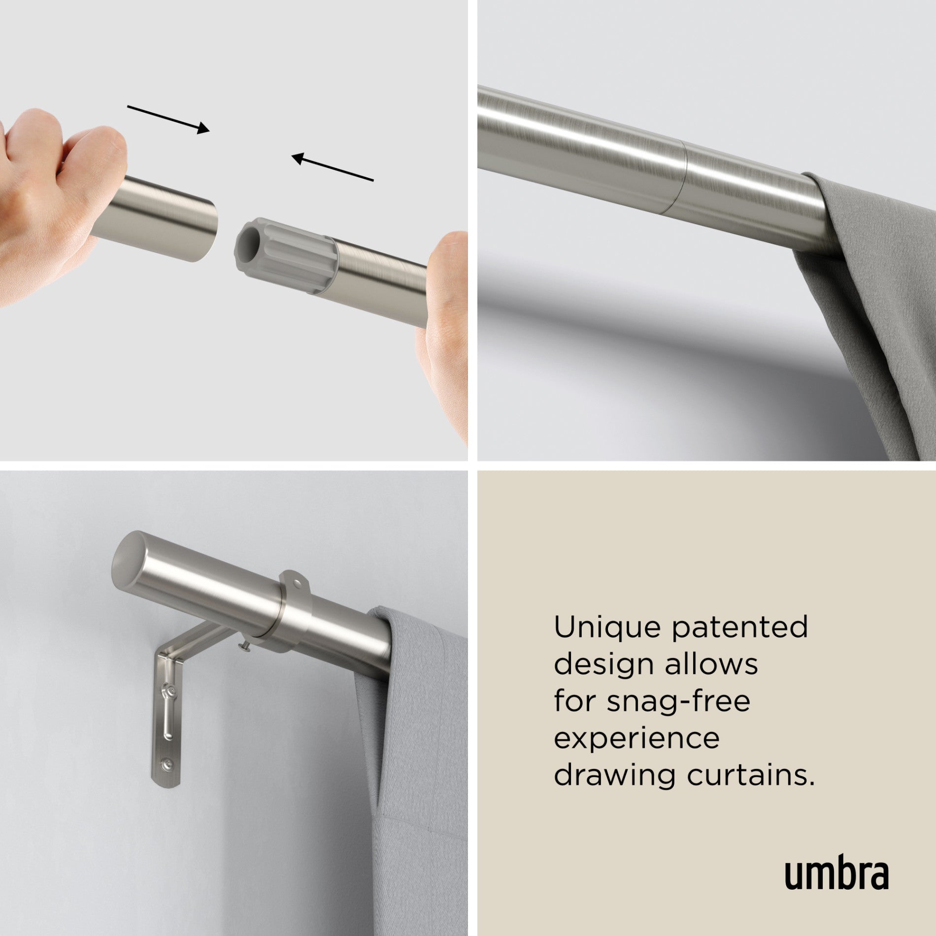 Both modern and versatile, Zen Curtain Rod features metal cylindrical finials, adding a modern and sophisticated touch to your drapery. Easy to install and assemble, Zen fits a wide range of windows and has a 1" (2.5cm) diameter rod. This curtain rod is made with an eco-friendlier finish. It produces 85% less water and solid waste than traditional electroplating finishes. To support the full 22 lb (10 kg) weight capacity, installation of the included center support bracket is required.